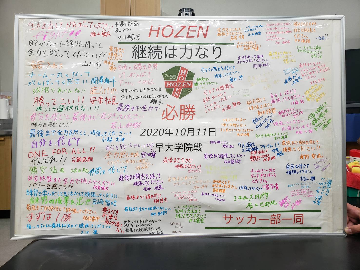 お知らせ 全国高校サッカー選手権二次予選 Tweet RSS 2020.10.11 全国高校サッカー選手権東京都二次予選一回戦 vs 早大学院 0-2 保善高サッカー部らしく最後まで諦めずに戦い抜きました。現地に応援できなかった選手達は寄せ書きを贈り、チーム一つで戦えました。今年度はコロナの影響で、試合や練習がいつもの様にできない中、色々な事を学び、最後までやり遂げました。 沢山の声援が本当に選手の力になりました。心から感謝します。ありがとうございました。
